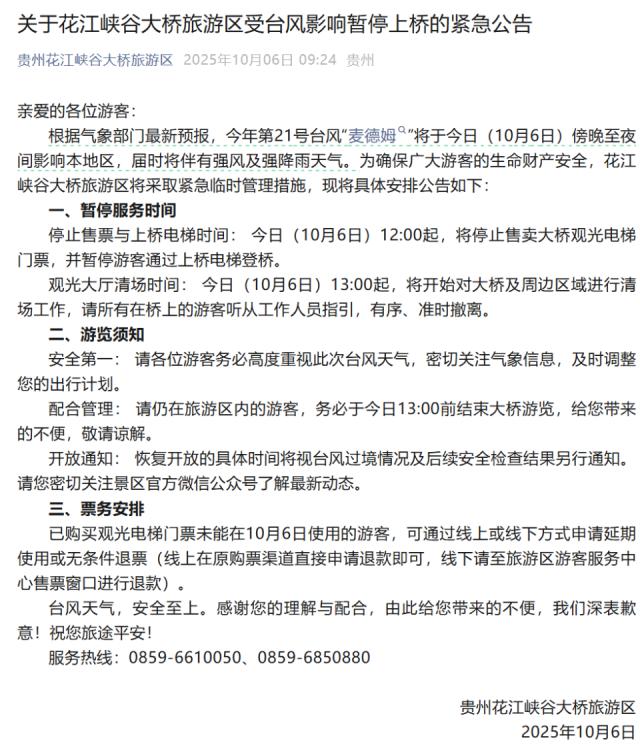 根据气象部门最新预报,今年第 21 号台风"麦德姆"将于今日(10 月 6 日)傍晚至夜间影响本地区,届时将伴有强风及强降雨天气。为确保广大游客的生命财产安全,花江峡谷大桥旅游区将采取紧急临时管理措施。