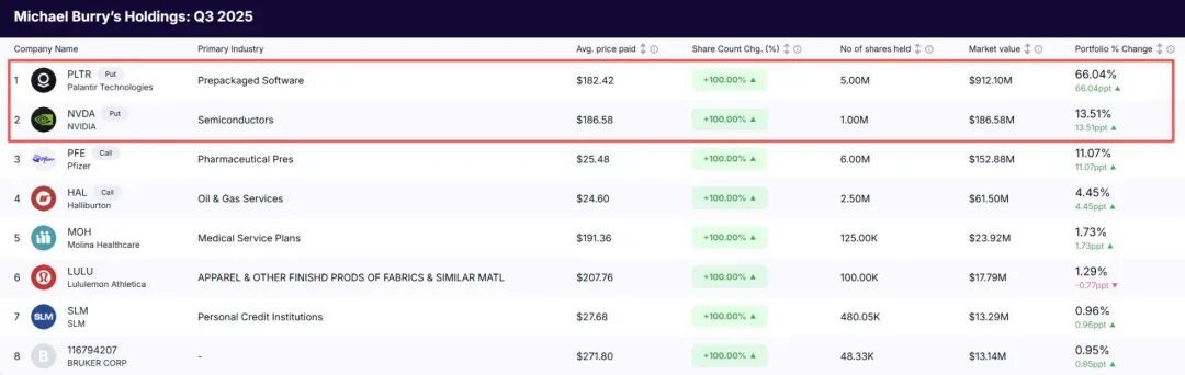 本月初,华尔街知名“空头”迈克尔·伯里披露了对英伟达的大量空头头寸,迈克尔·伯里旗下对冲基金Scion Asset Management披露的第三季度持仓报告显示,该基金持有价值约9.12亿美元的500万股Palantir看跌期权和价值约1.87亿美元的100万股英伟达看跌期权(占其资产总值的80%)。