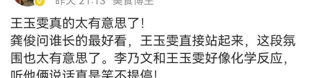 她在综艺里完全放飞自我,搞笑又真实。节目刚开始,陈赫和李乃文想“整”她,设计了个服从测试,故意站着不坐,看她会不会慌。结果王玉雯一点不怵,淡定地说:“你们也可以坐,我就不起来!”一句话把两个老油条噎得没话说,网友直呼:“这小姑娘有种!”